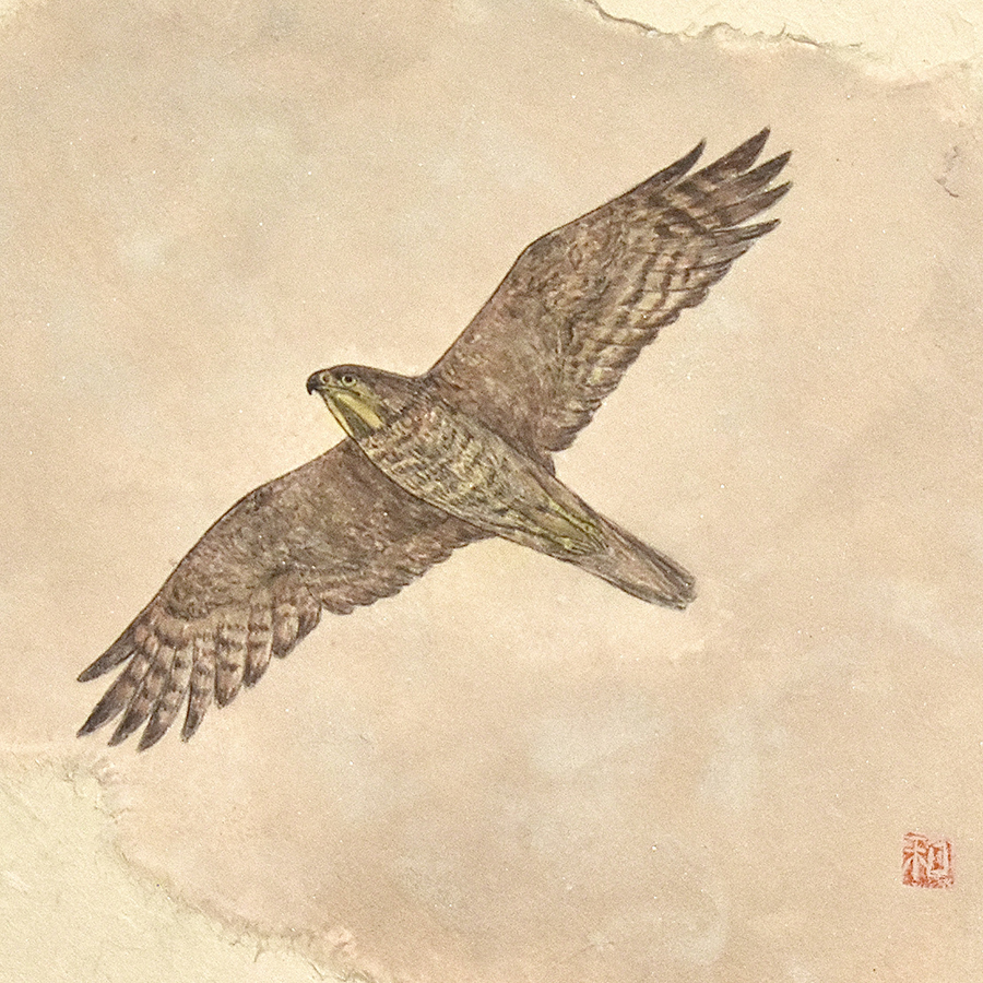 これらの背景もあって自身のマインドも変容してきた訳であるが、一方で「絵画素材やその背景に関心を抱きつつも、自身の制作へ落とし込むことができていない。」という矛盾にずっと苛まれてきた。それを払拭するために今回の展覧会の制作においては" 素材(和紙)を見せる表現 "を念頭に制作に臨んでいる。ご提供いただいた本美濃紙(岐阜県美濃市)には墨で百合の花を描き、新緑を彷彿とさせる染色紙(烏山和紙)。そして地元の地域を象徴とする紙である程村紙(栃木県那須烏山市)には、私の一番好きな鳥であるサシバを描くこととした。絵の具を塗り重るという行為を排除し、最小限の要素で何をどう描けるのか試すことは挑戦でもあった。自身の矛盾が完全に払拭できたわけではないが、制作をする際の表現の幅を広げることができたのは大きな成果である。